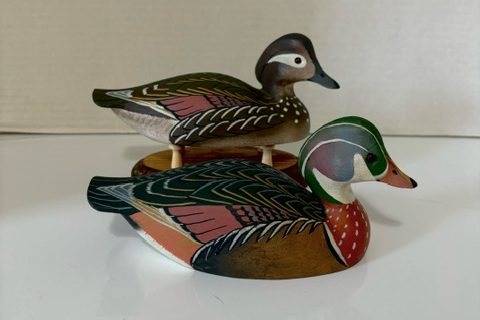 William “Bill” Cranmer Beach Haven, New Jersey Wood duck miniature pair. All original paint and form. Cranmer was highly skilled at painting and many of his decoys resemble Ward quality. $225 pair