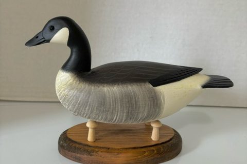 Frederick Brown Ocean County NJ Miniature Canadian Goose decoy. This decoy retains all original condition and Rick’s wonderful paint job. It is signed on the bottom and has a small wight and leather strap. $175