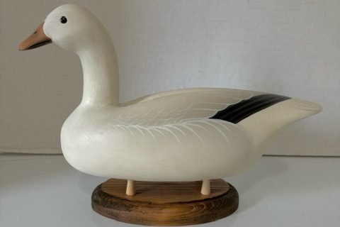 Snow Goose miniature by Chris Nicholson of Worton MD. This decoy definitely has Charlie Joiner influence and is nicely painted. The Botom is signed and dated 2000 and made for the Ducks Unlimited Dinner in Betterton MD $150