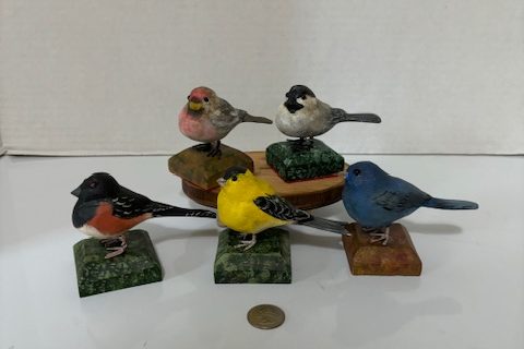Miniature Songbird carvings on bases. Many different species carved and painted by Jeff Van Brookhoven Lititiz PA $35 each